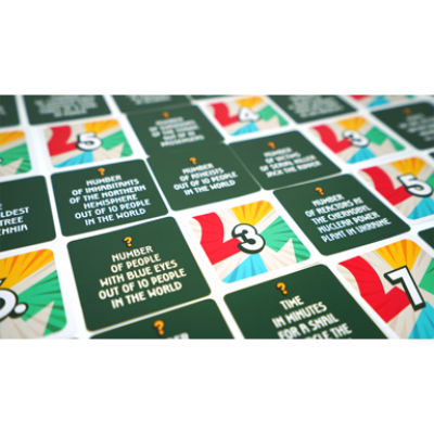 Draw a card, estimate the numbered answer, show the answer to your opponents then decide if your team will keep this card to improve your chances of getting closer to 21. Keep track of the estimated value of your cards and the true value of your opponent's hand when deciding to hit or pass. Will you bust and break or qualify as the Ultimate Quiz Whizzes?!